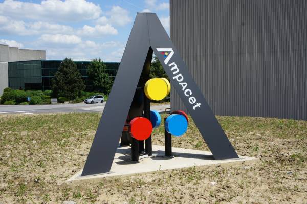 Coiffes en dibond 3mm noir mat. Logo en 3D Acrylox mis à la teinte rouge.